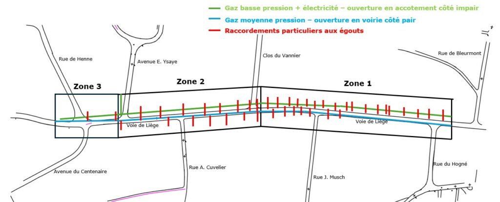Ces interventions s’inscrivent dans la continuité de la phase 1 des travaux de la Voie de Liège et concernent à la fois la modernisation de la voirie et des trottoirs ainsi que l’amélioration des réseaux de gaz, d’électricité et d’égouttage.