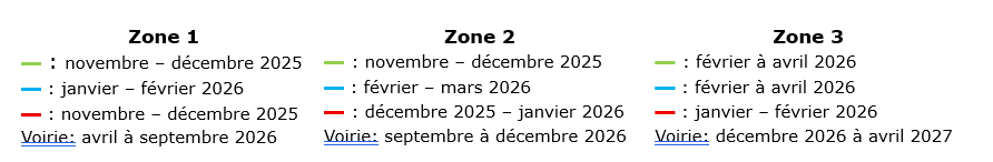 - Le planning communiqué est une projection théorique. Le calendrier pourra être adapté en fonction de contraintes techniques (notamment liées aux interventions de RESA) et météorologiques.